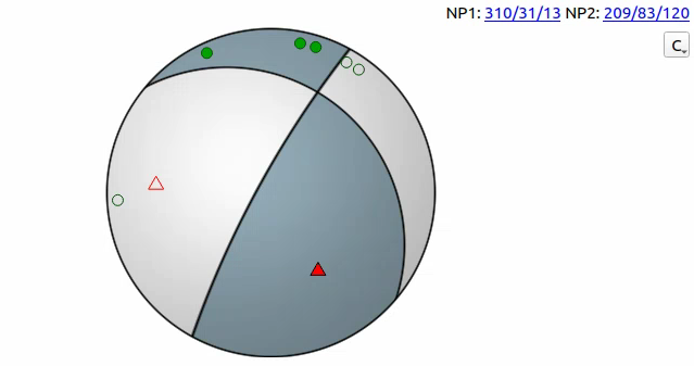 FSSN根据P波初动方向分析出了此次地震的初动震源机制解(因周边可用测站少,数据质量不佳,仅供参考)