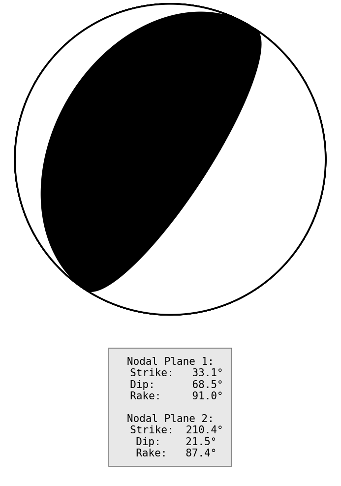 节面1: 走向33.1度 倾角68.5度 滑动角91.0度