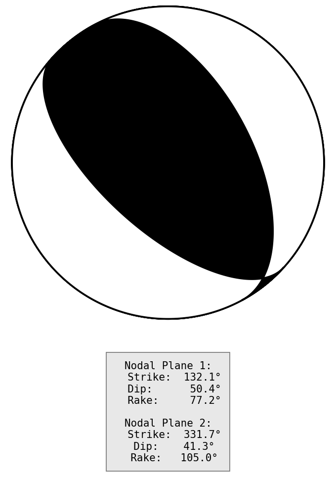 节面1: 走向132.1度 倾角50.4度 滑动角77.2度