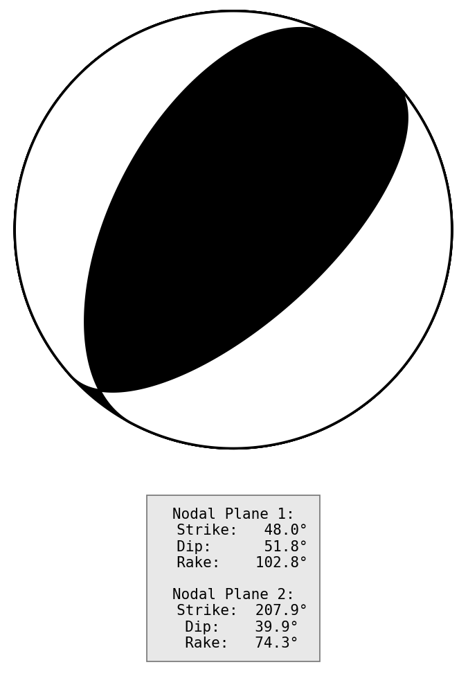 节面1: 走向48.0度 倾角51.8度 滑动角102.8度