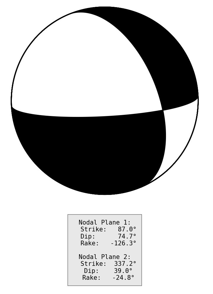 节面1: 走向87.0度 倾角74.7度 滑动角-126.3度