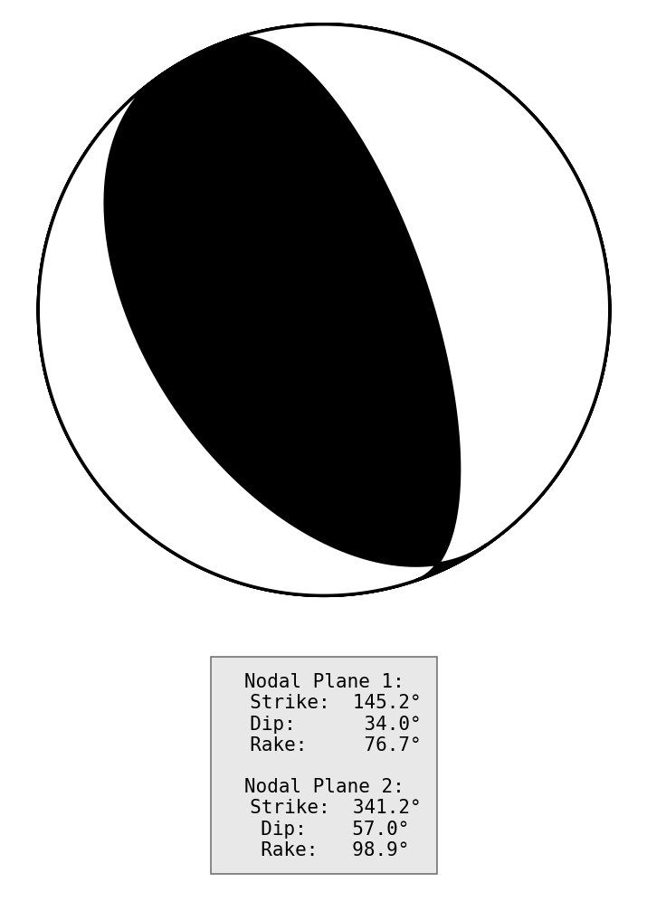节面1: 走向145.2度 倾角34.0度 滑动角76.7度
