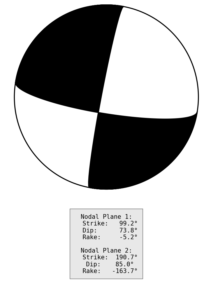 节面1: 走向99.2度 倾角73.8度 滑动角-5.2度
