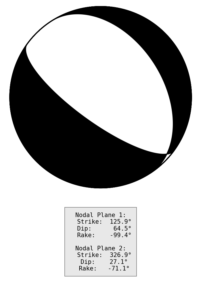 节面1: 走向125.9度 倾角64.5度 滑动角-99.4度