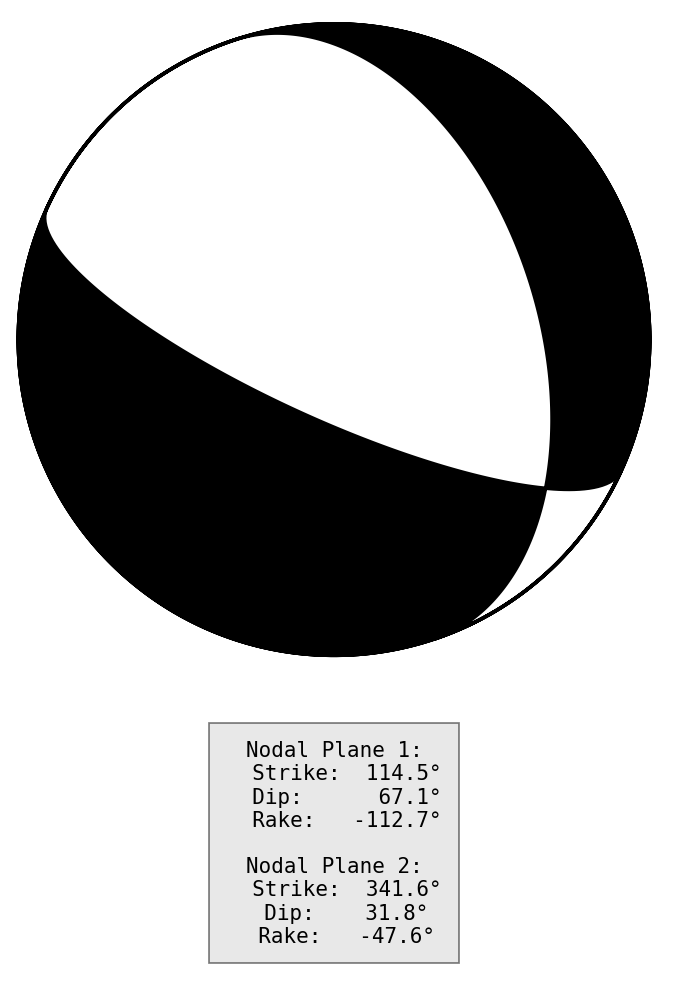 节面1: 走向114.5度 倾角67.1度 滑动角-112.7度