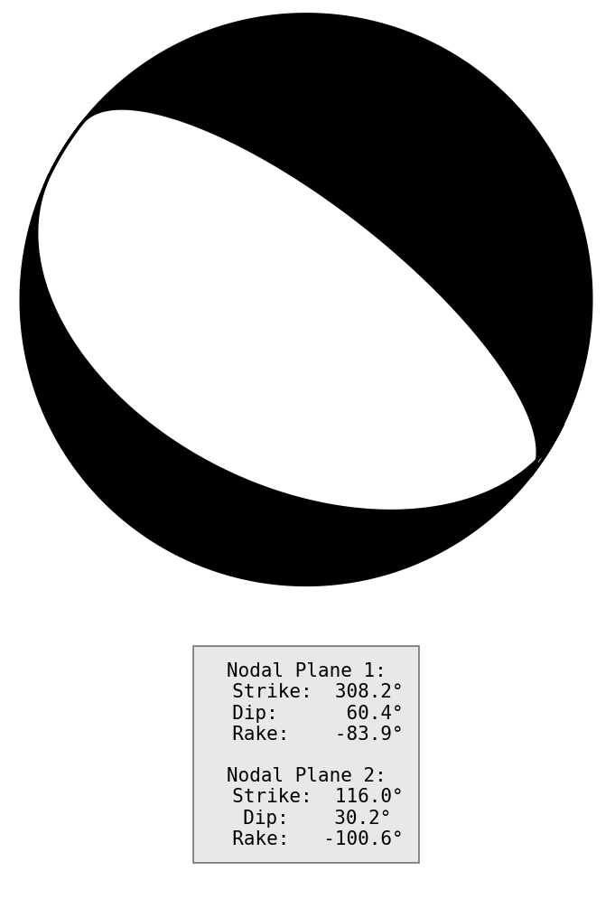 节面1: 走向308.2度 倾角60.4度 滑动角-83.9度