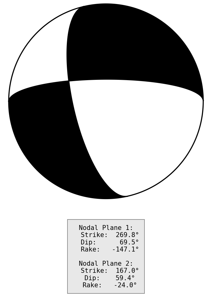 节面1: 走向269.8度 倾角69.5度 滑动角-147.1度