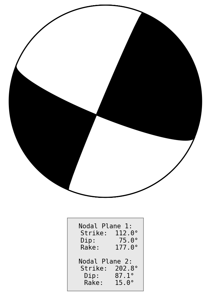 节面1: 走向112.0度 倾角75.0度 滑动角177.0度