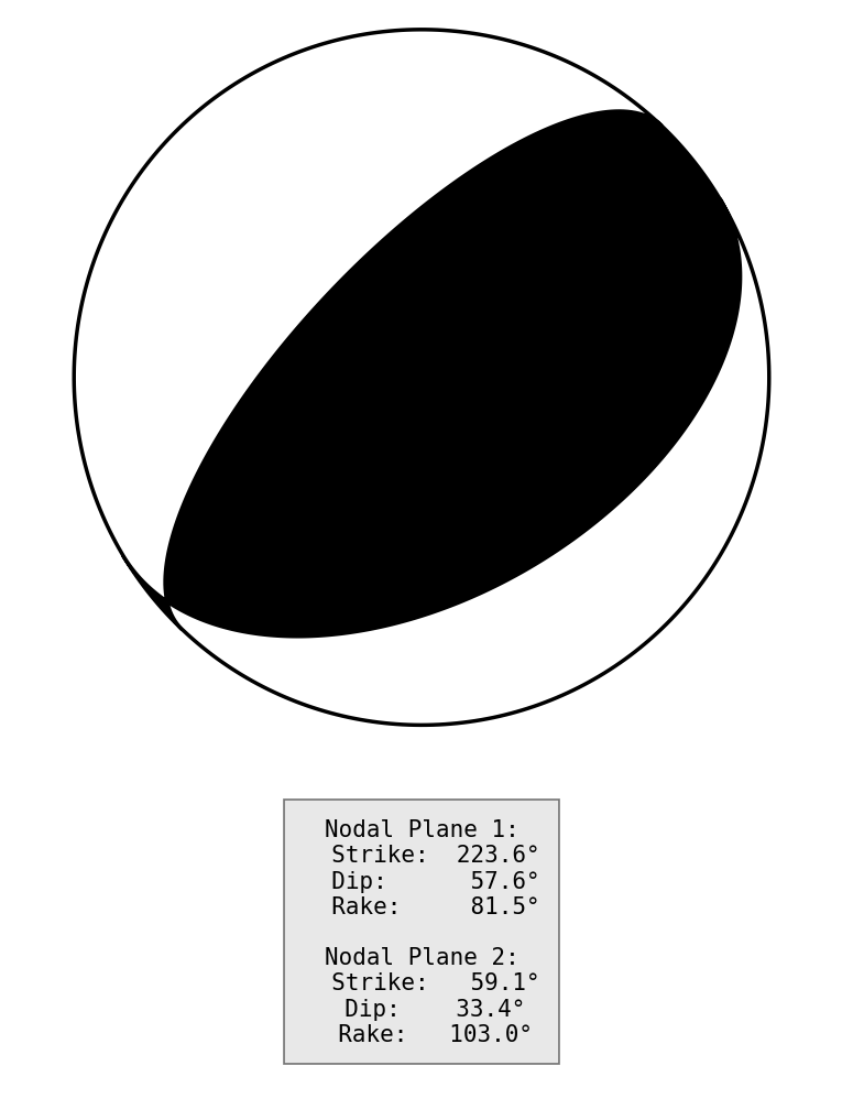 节面1: 走向223.6度 倾角57.6度 滑动角81.5度