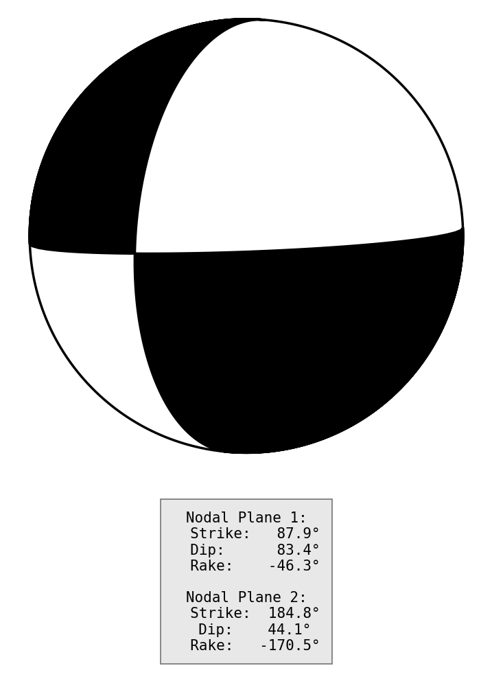节面1: 走向87.9度 倾角83.4度 滑动角-46.3度