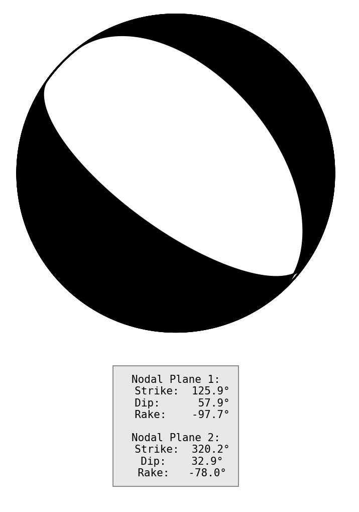 节面1: 走向125.9度 倾角57.9度 滑动角-97.7度