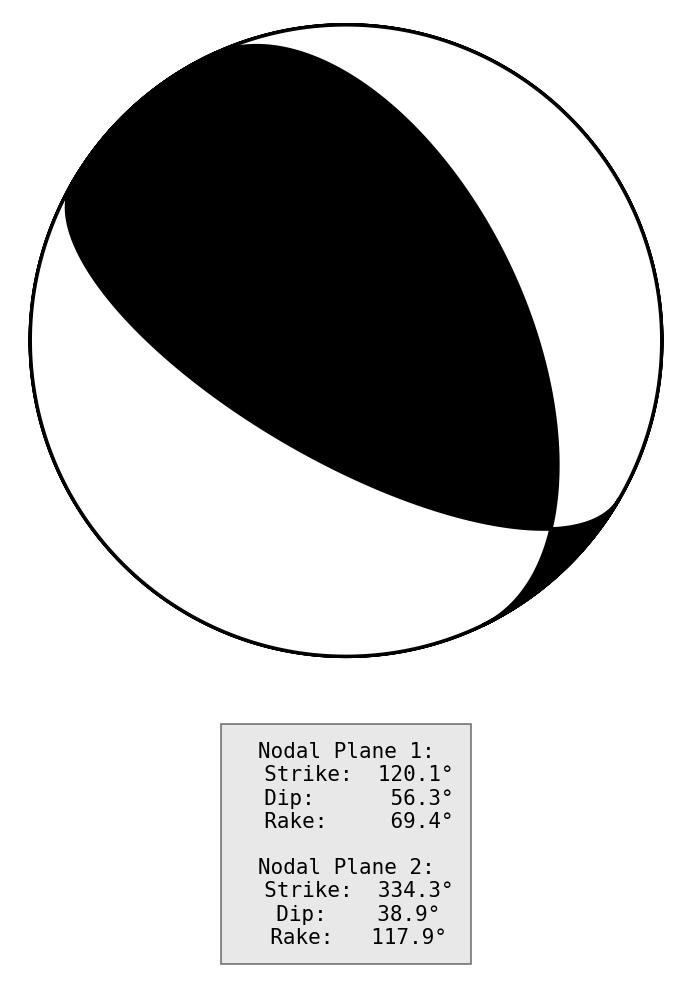 节面1: 走向120.1度 倾角56.3度 滑动角69.4度