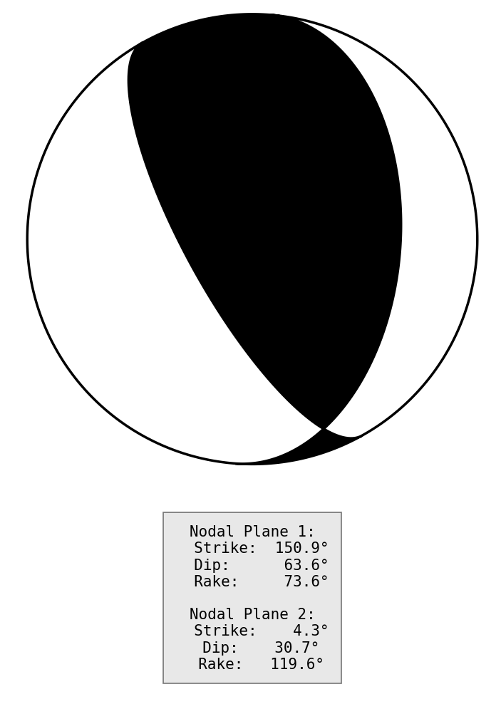 节面1: 走向150.9度 倾角63.6度 滑动角73.6度