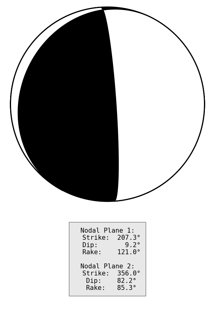 节面1: 走向207.3度 倾角9.2度 滑动角121.0度