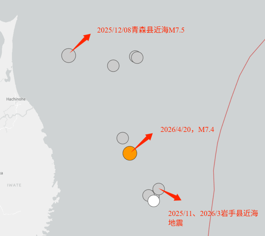 2026年4月20日,一场Mj7.7(Mw7.4)地震发生在日本岩手县宫古市东北偏东100km处。震源机制解表明,这场地震由北美板块和太平洋板块交界的逆冲断层引发,属于板间地震。矩心深度为地下21.6km,属于浅源地震。